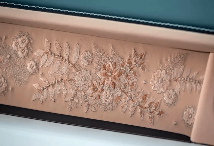 内饰方面同样采用蕾丝启迪的刺绣作品为设计灵感,幻影独有的“艺境藏珍”画廊横向贯穿仪表台,Bespoke高级定制设计师以定制蕾丝为灵感创作了花卉主题刺绣,并通过丰富的刺绣技法、绣线密度与包括玫瑰金(Rose Gold)、日出红(Sunrise)与燕麦色(Oatmeal)在内的多种色调层层交叠,优雅演绎出花瓣、蕨叶与蕾丝的细腻质感。