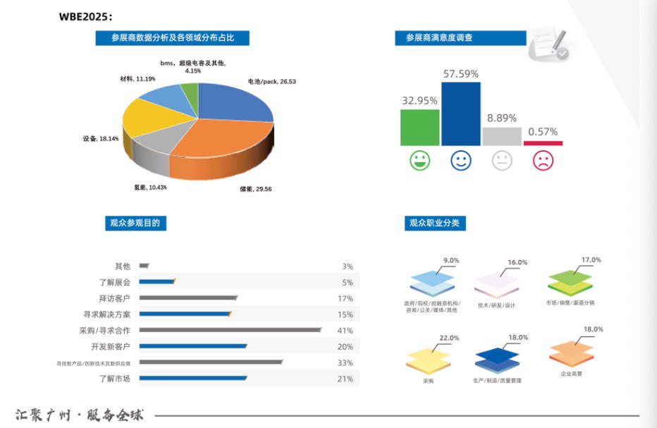 WBE2025第10届世界电池及储能产业博览会暨亚太电池展/亚太储能展于2025年8月8-10日在广州广交会展馆成功举办,总展览面积约13.5万平方米,汇聚1500多家参展企业,构建全产业链生态展示与商贸对接平台。本届展会共接待专业观众20万人次参与,其中来自全球100多个国家和地区的国际采购商13892人次。本届博览会形成电池、储能、氢能、光伏、材料、设备、配套装备等全产业链生态闭环,为全球电池、储能产业链制造商及应用端买家群搭建展示、交流与贸易平台。
