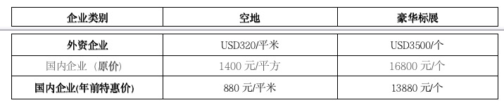 备注:1)标准展位均为豪标,单个豪标展位规格为(3m×3m),配置包括:展板、地毯、射灯、玻璃圆桌等,请参考豪标效果图;2)双面开口标准展位角位费:国内企业RMB500元/个,外资企业加收10%;3)光地展位:不含任何配置,由企业自行设计与搭建。