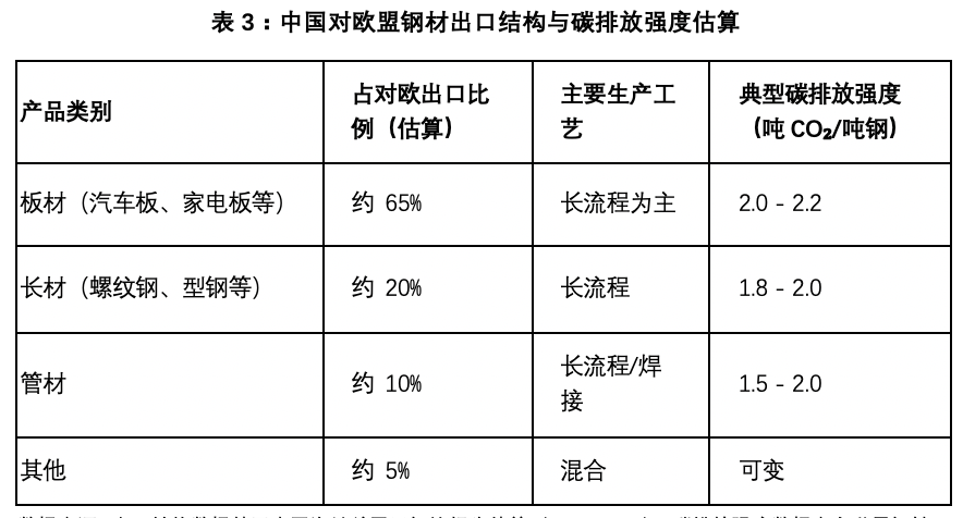 中国对欧盟出口的钢材以高附加值的板材(如汽车板、家电板)和部分型材为主,这些产品正是长流程的优势领域,也意味着更高的碳排放基数。